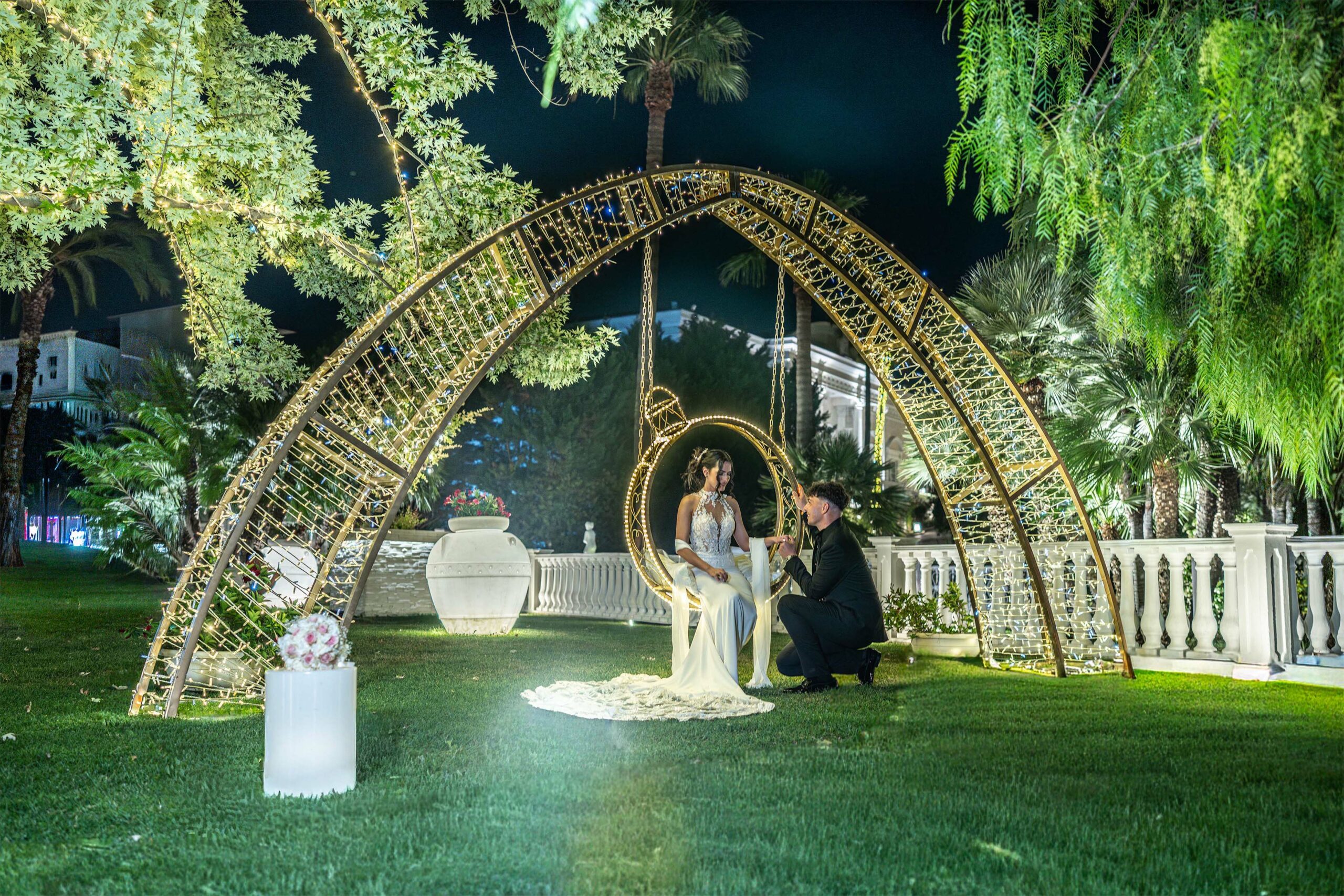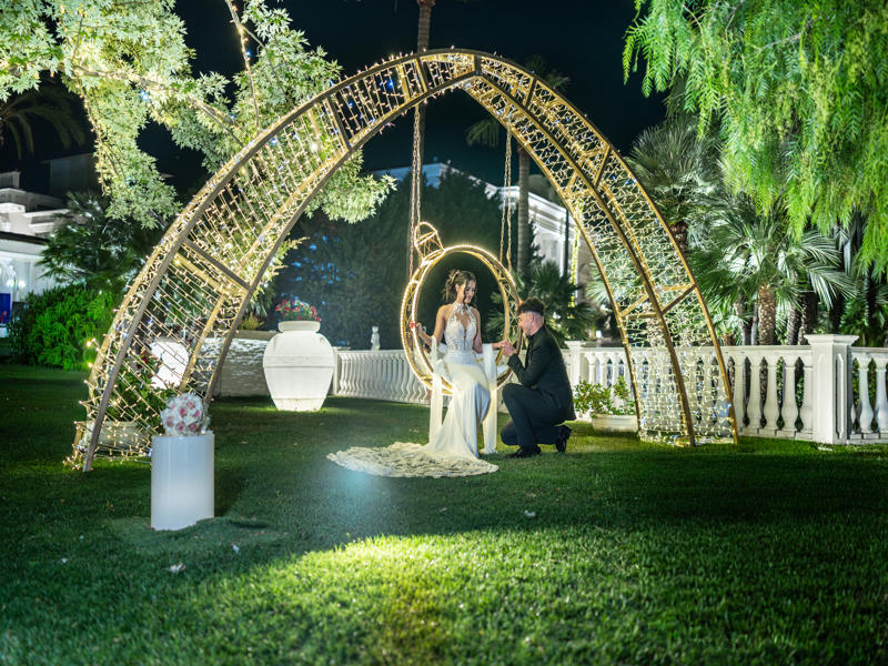 Immagina un giardino immerso nel verde, una serata tiepida e il bagliore delicato delle luci che disegna un arco brillante. Al centro, un’altalena elegante che diventa immediatamente protagonista: un punto scenografico ideale per gli sposi, per gli invitati e per chiunque desideri vivere un momento sospeso tra realtà e incanto.